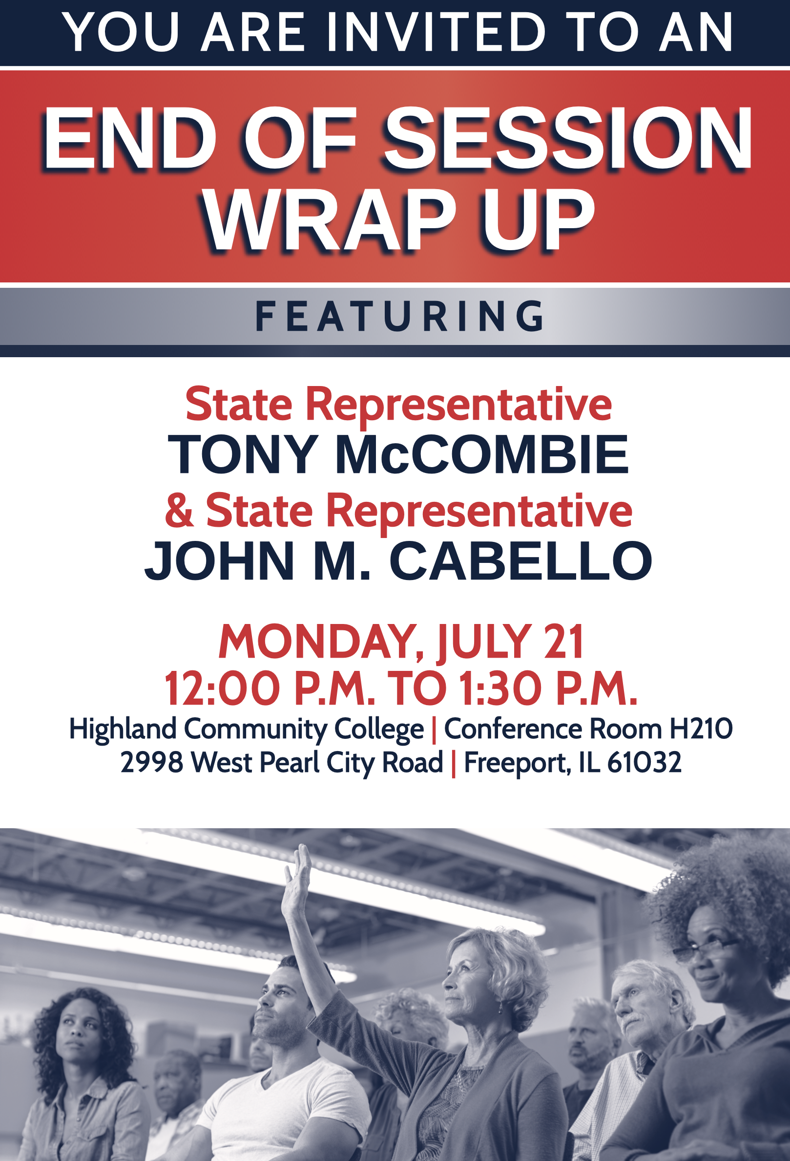 State Representative and Assistant House Republican Leader John M. Cabello (R-Machesney Park) will be joined by House Republican Leader Tony McCombie (R-Savanna) for an End-of-Session Wrap-Up on Monday, July 21st at Highland Community College.