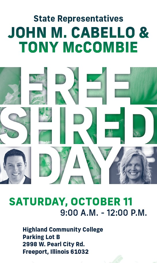 FREEPORT – State Rep. John M. Cabello (R-Machesney Park) and Illinois House Minority Leader Tony McCombie are hosting a Free Paper Shredding Event in Freeport on Wednesday, October 11th. Any…