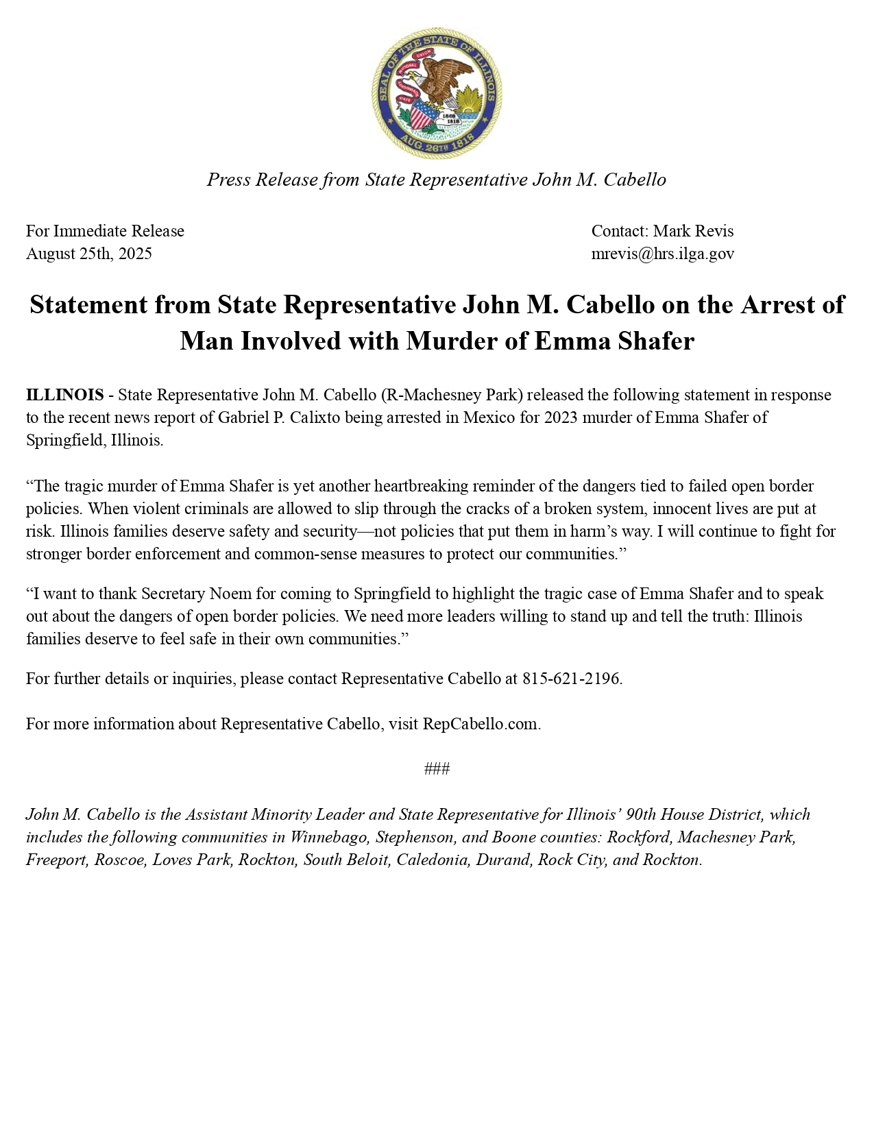 ILLINOIS – State Representative John M. Cabello (R-Machesney Park) released the following statement in response to the recent news report of Gabriel P. Calixto being arrested in Mexico for 2023…