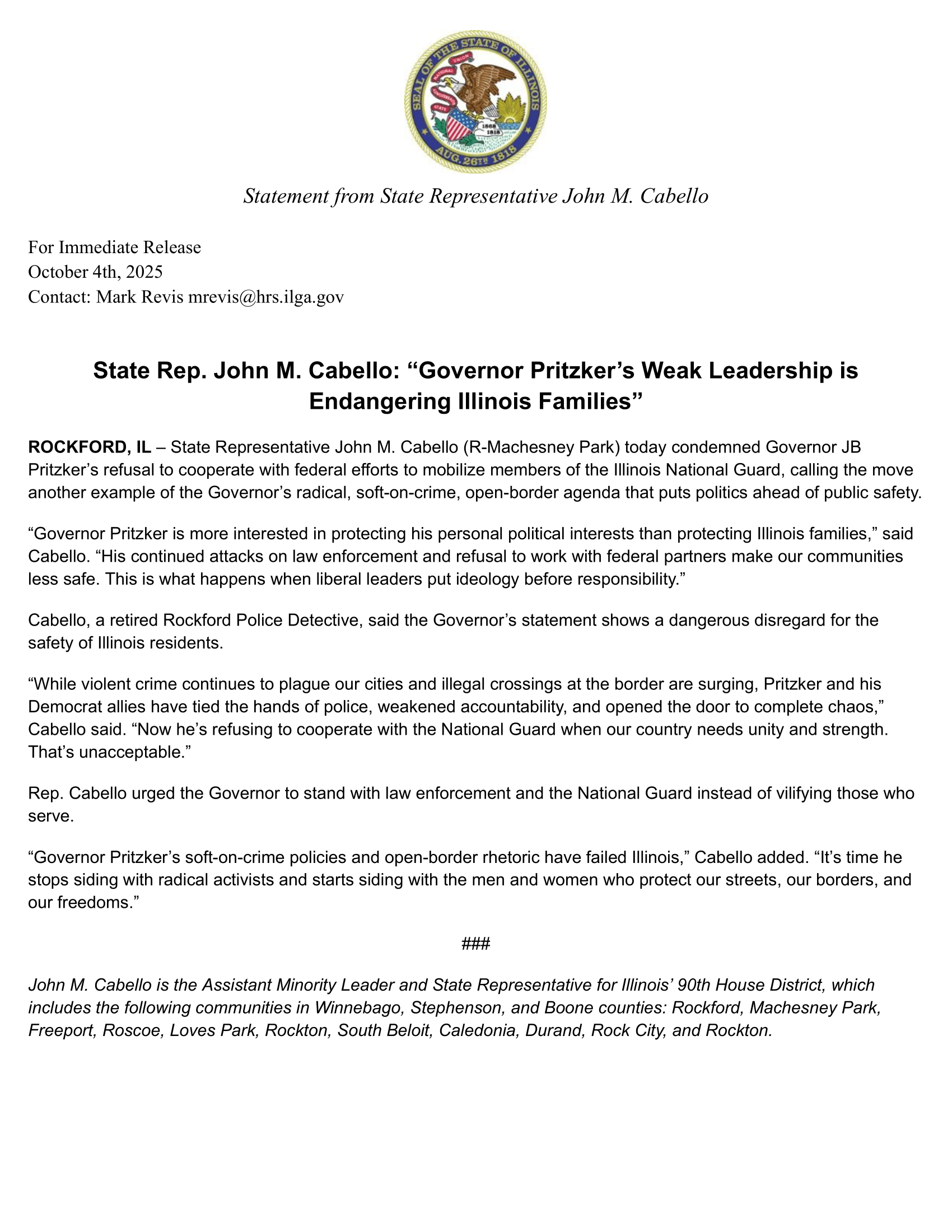 ROCKFORD, IL – State Representative John M. Cabello (R-Machesney Park) today condemned Governor JB Pritzker’s refusal to cooperate with federal efforts to mobilize members of the Illinois National Guard, calling…