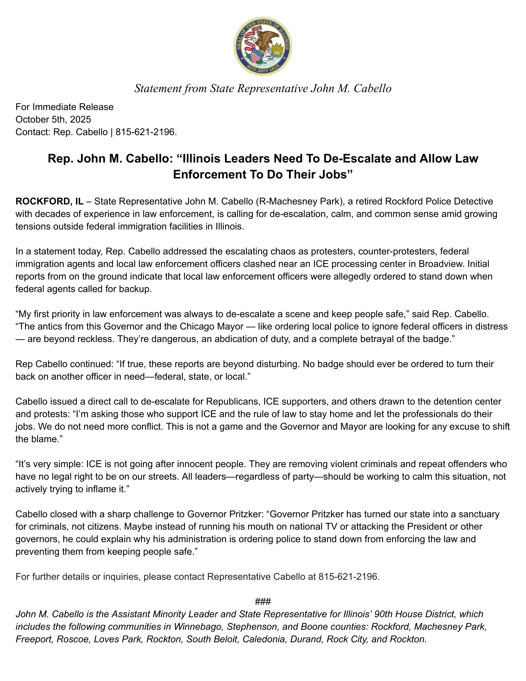 ROCKFORD, IL – State Representative John M. Cabello (R-Machesney Park), a retired Rockford Police Detective with decades of experience in law enforcement, is calling for de-escalation, calm, and common sense…