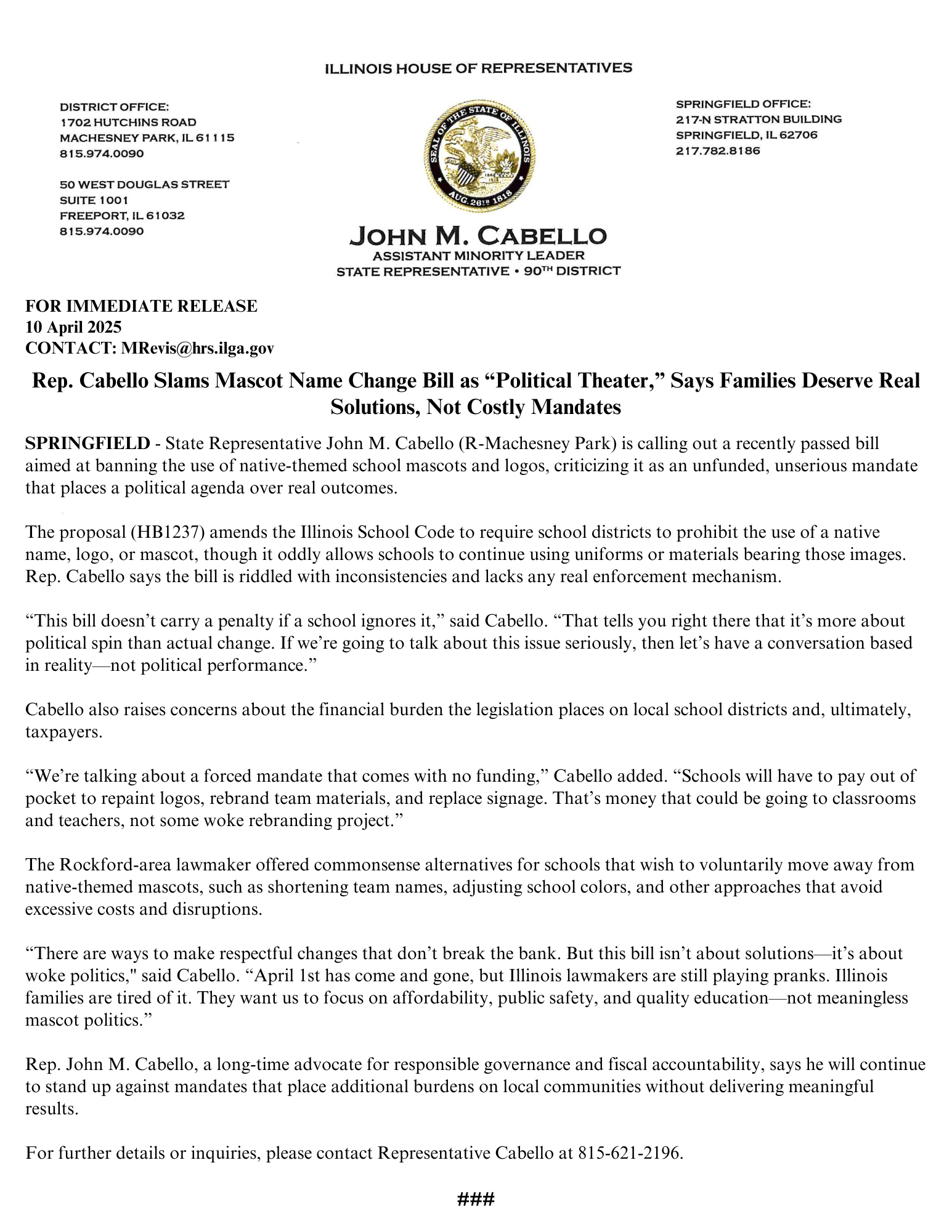 ROCKFORD – State Representative John M. Cabello (R-Machesney Park) is asking residents of the 90th District to take part in his 2025-2026 Legislative Survey to help shape his priorities in…